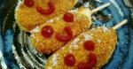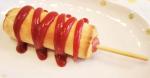 竹串にソーセージとさけるチーズを竹串に刺し、ホットケーキミックス・卵・牛乳で作った生地を周りに巻いて、卵とパン粉を付けて油で揚げたら出来上がり。