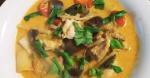 フライパンで鶏肉とカレーペーストを炒め、煮立ったココナッツミルクに入れます。残りのカレーペースト、野菜、調味料を入れたら出来上がり。